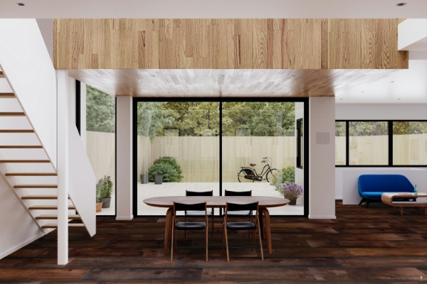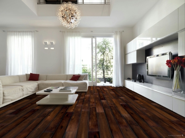 Wire-brushed flooring with rich hand-stained tones that fade naturally into timeworn edges.