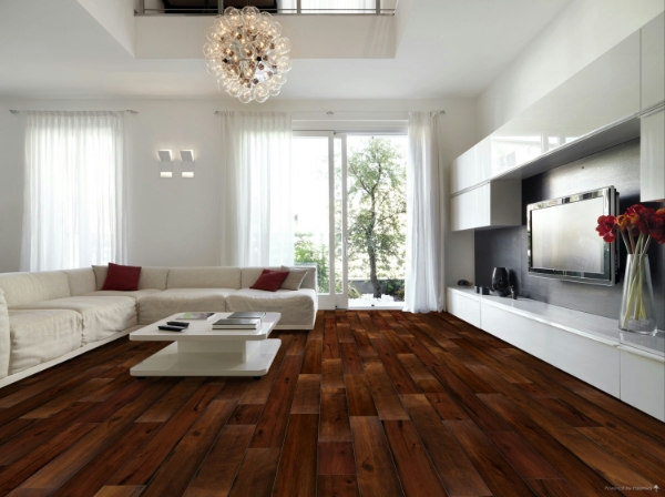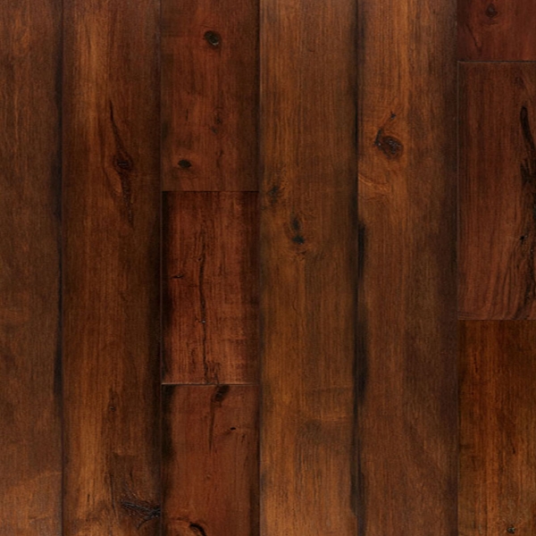 Wire-brushed flooring with rich hand-stained tones that fade naturally into timeworn edges.