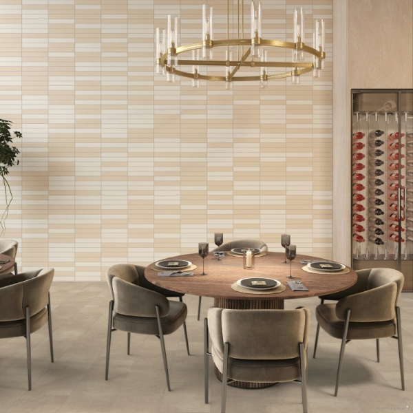 Chord ColorBody porcelain lets you set your own style on floors, walls, or countertops. Its rich neutral plaster and cement visuals can be complemented with textured accents or triangle mosaics for a modern, dynamic look.
