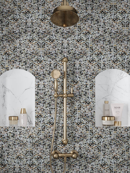 MiR Mosaic - Aquaterra Hexagon Black 9 in. L x 7.9 in. W Tile & Stone Flooring (2.48 sq. ft./box)